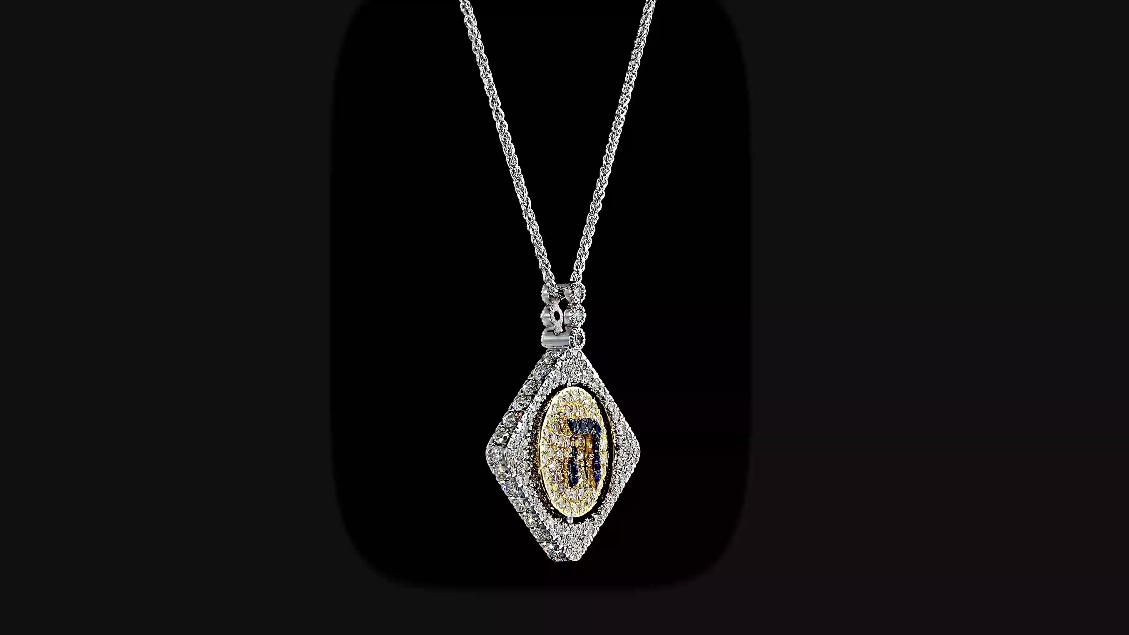 A unique pendant that integrates four different designs within a single piece of jewelry. This is a double-sided pendant in 18k gold that combines a circle and a square in splendid harmony. The square is of 18k white gold while the circle is of 18k yellow gold. The circle within the square spins on an axis, creating a new look with each spin. One side of the square is set with round brilliant diamonds, with four precious stones embedded in each of its four corners: a ruby, an emerald, a sapphire, and a diamond. The opposite side is set entirely with diamonds. The circle spinning within the square is set with black diamonds and centered within them is the Hebrew letter Hei ('ה) in diamonds. Nestled within the heart of the letter Hei lies a diamond, hinting at its essence. The other side of the circle is set with round brilliant diamonds adorned with the Hebrew letter Hei ('ה) in 18k yellow gold. Nestled in the heart of the letter Hei lies a sapphire. The pendant comes with an adjustable chain with a maximum length of 55 cm (21.7").